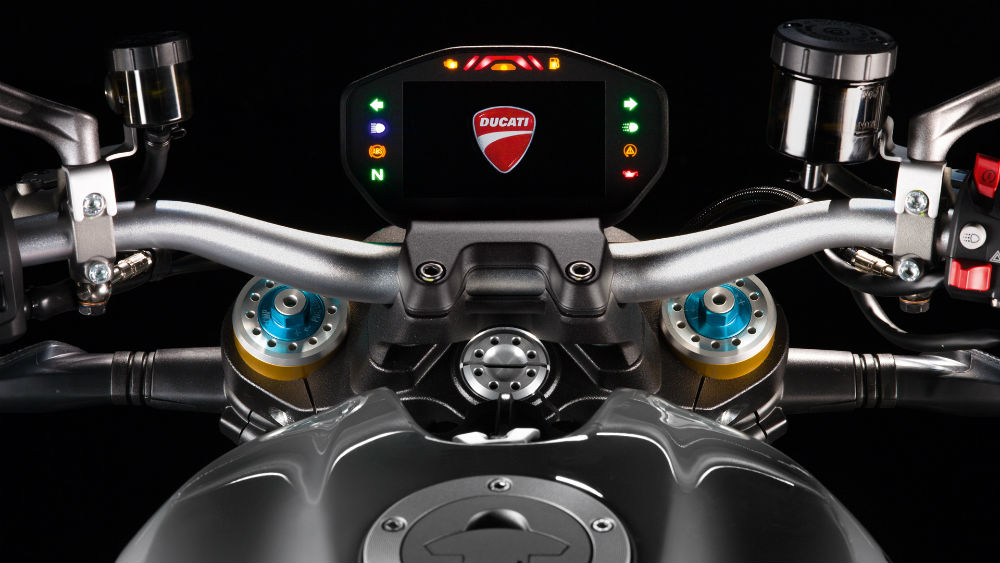 De acordo com a Ducati, “A exclusiva Monster 1200 S acentua ainda mais a essência esportiva da Monster, graças aos componentes de qualidade superior como as suspensões sofisticadas Öhlins e o sistema frenante Brembo M50. Além disso, a Monster 1200 S, dotada de sistema Ducati Quick Shift (DQS) up/down, de rodas com 3 raios em Y, com gráfica exclusiva em “S” e o para-lama dianteiro em carbono. O sistema (Daytime Running Light) para o projetor dianteiro e os indicadores de direção são a LED e completam os equipamentos de série.”
