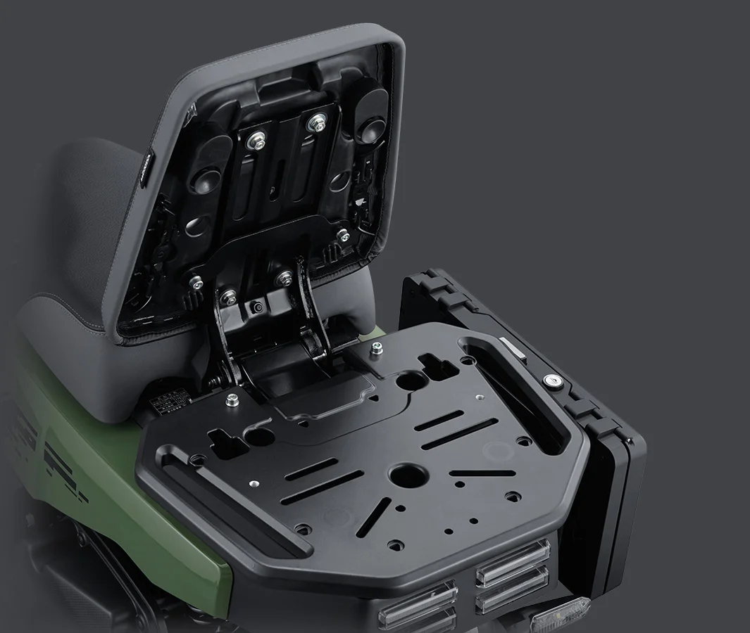 Na frente, a moto conta com um pequeno rack que permite acomodar alguma carga. Já na traseira, o assento do garupa pode ser rebatido, virando um encosto para o piloto, e liberando outro rack para carregar mais carga ou instalar um baú.